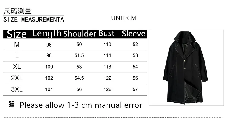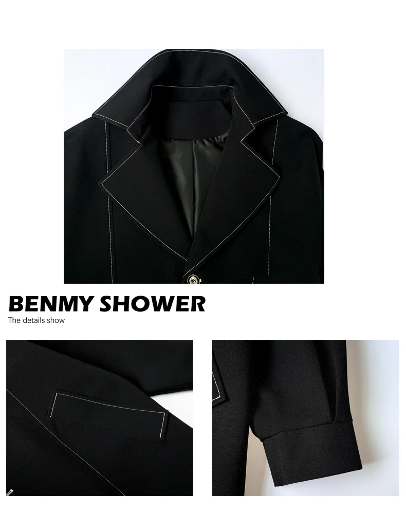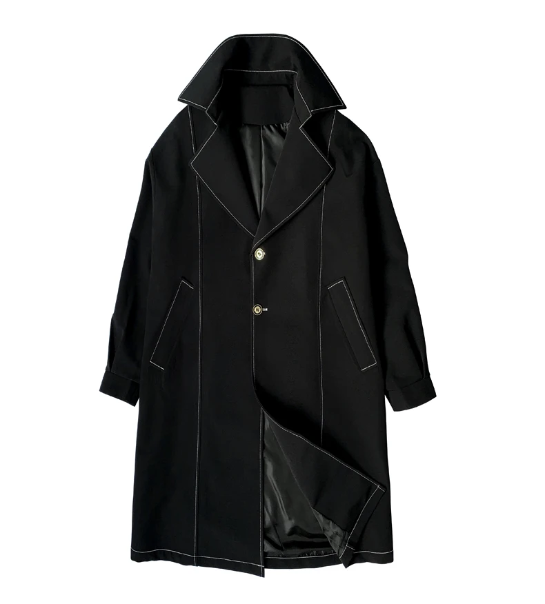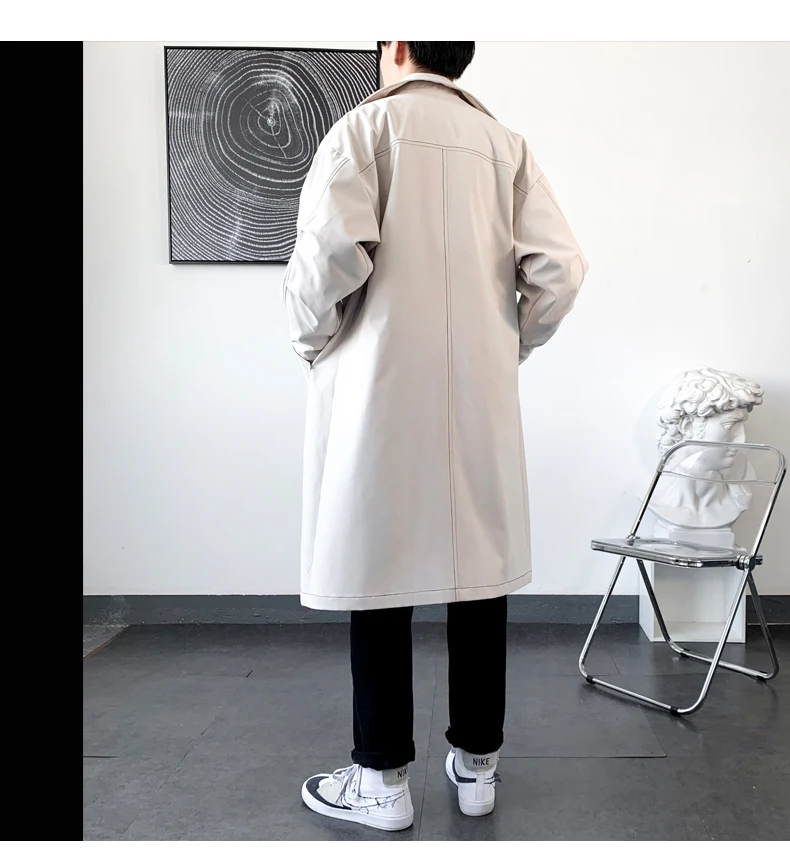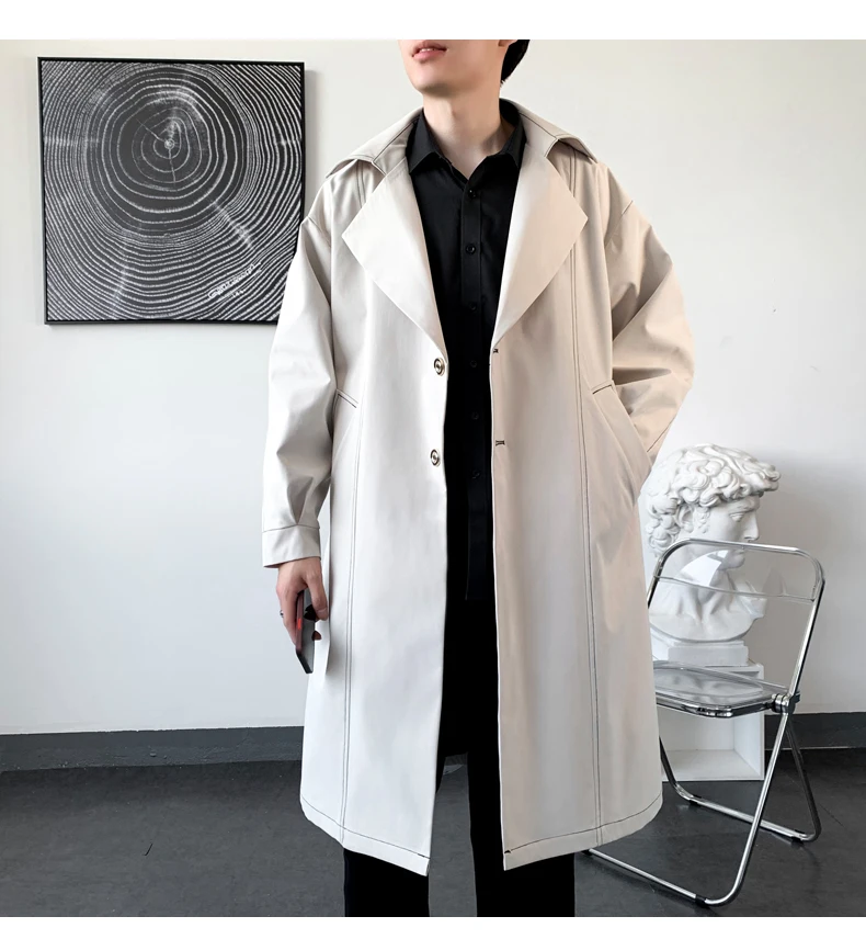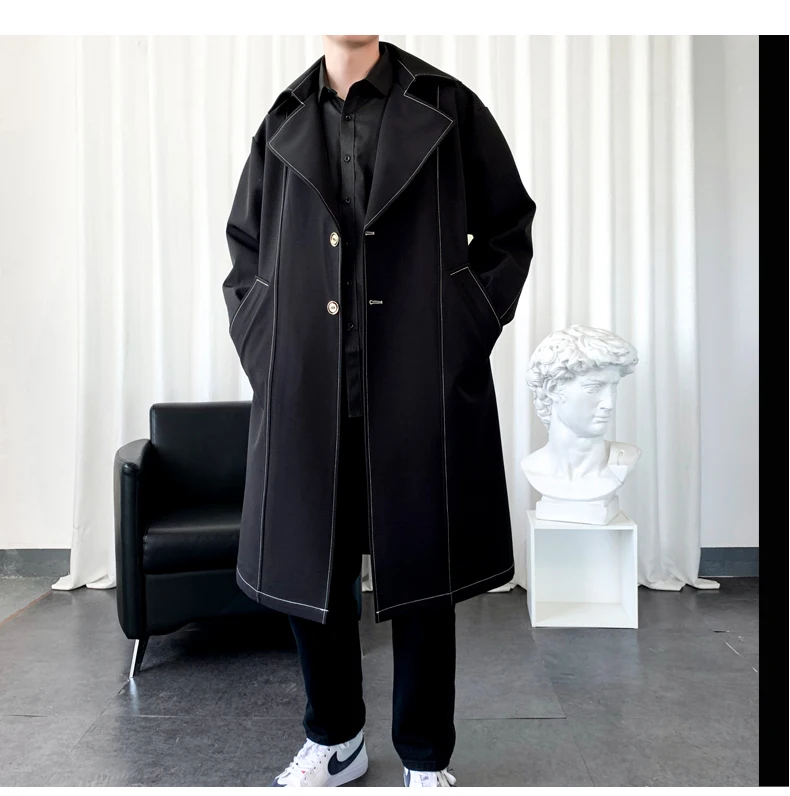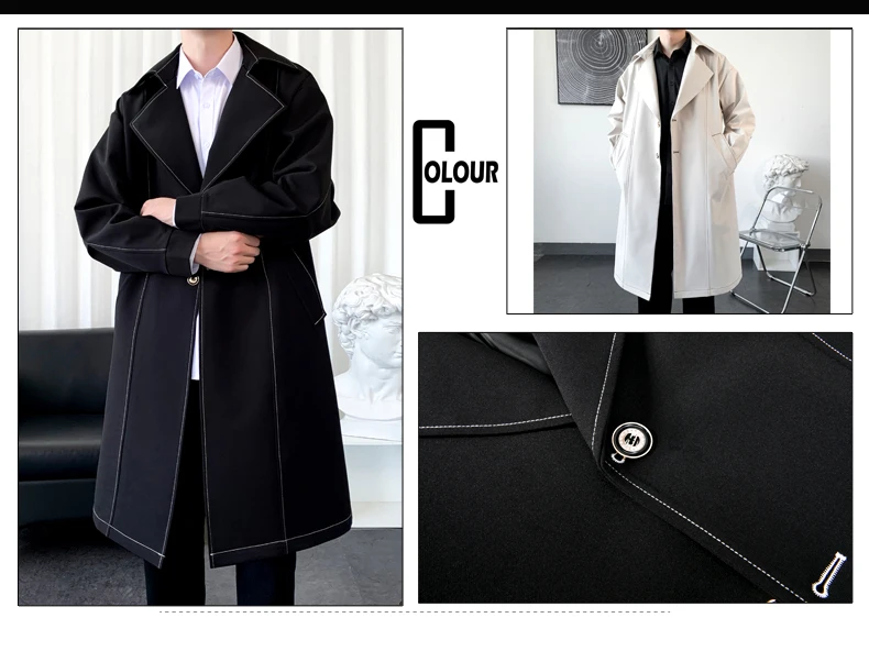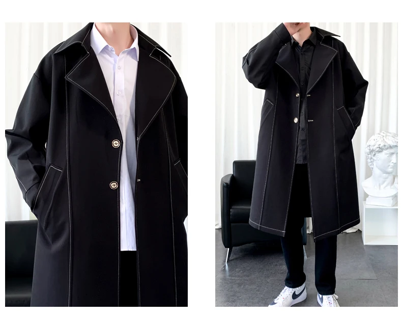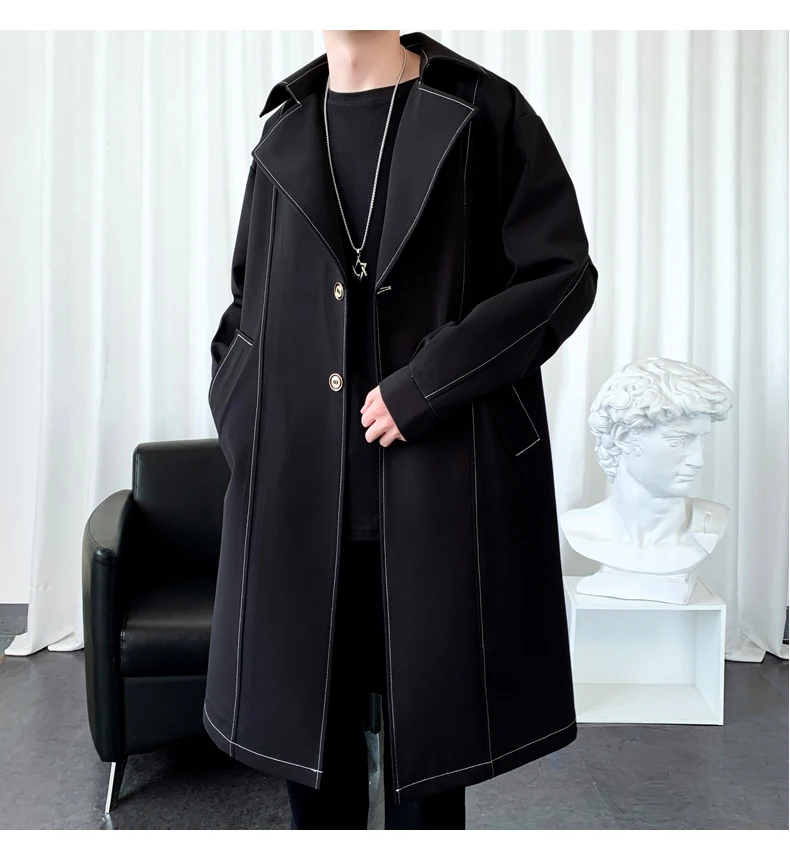 معطف ترنش رجالي عالي الجودة، معطف ترنش أنيق للخريف والشتاء، معطف ترنش طويل بصف واحد من الأزرار، معاطف وسترات سوداء سادة للرجال