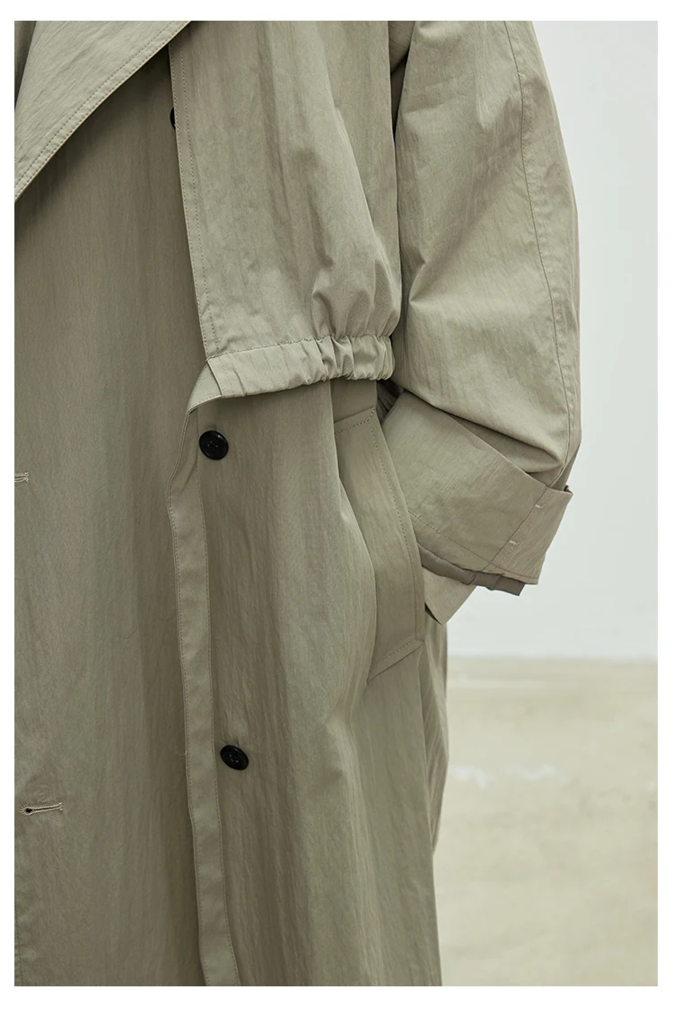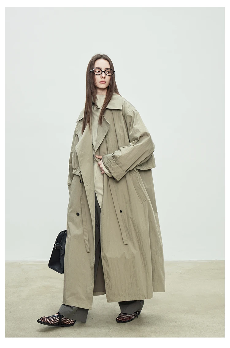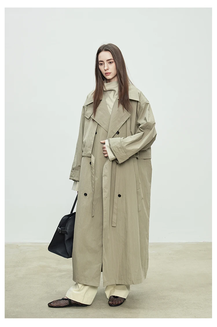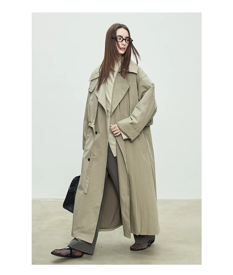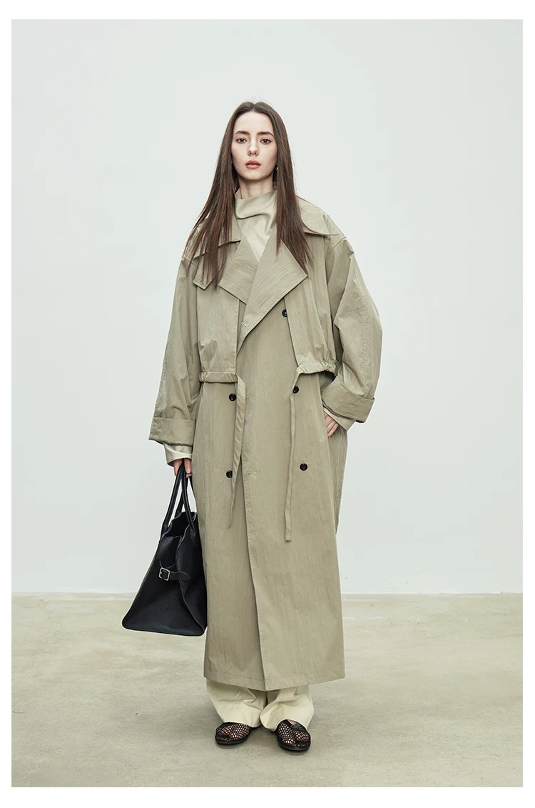 معطف Lautaro طويل كبير الحجم من الكاكي لربيع وخريف المرأة الأوروبية العصرية غير الرسمية فضفاض مزدوج الصدر 2025